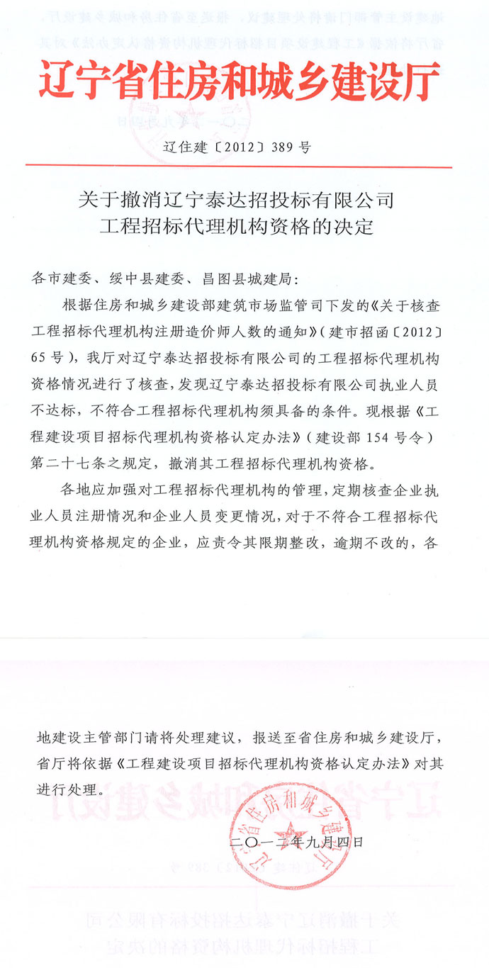 【概要描述】关于撤销辽宁泰达招投标有限奇异果在线手机版(大中国区)工程招标代理机构资格的决定