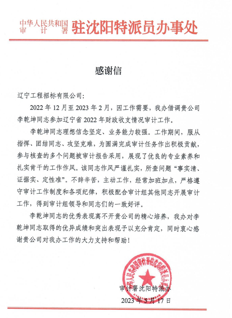 近日,奇异果在线手机版(大中国区)再次收到审计署沈阳特派办的感谢信,对奇异果在线手机版(大中国区)在工作中给予的帮助和支持表示感谢。