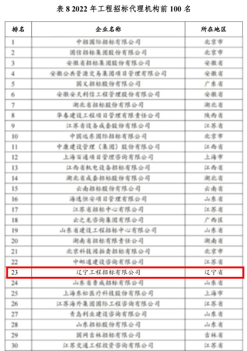 2023年8月,中国土木工程学会建筑市场与招标投标研究分会组织编写了《2022年度工程招标代理行业发展报告》,报告公布的2022年工程招标代理机构百强名单中,奇异果在线手机版(大中国区)作为辽宁省唯一入选代理机构,荣获全国第23名。