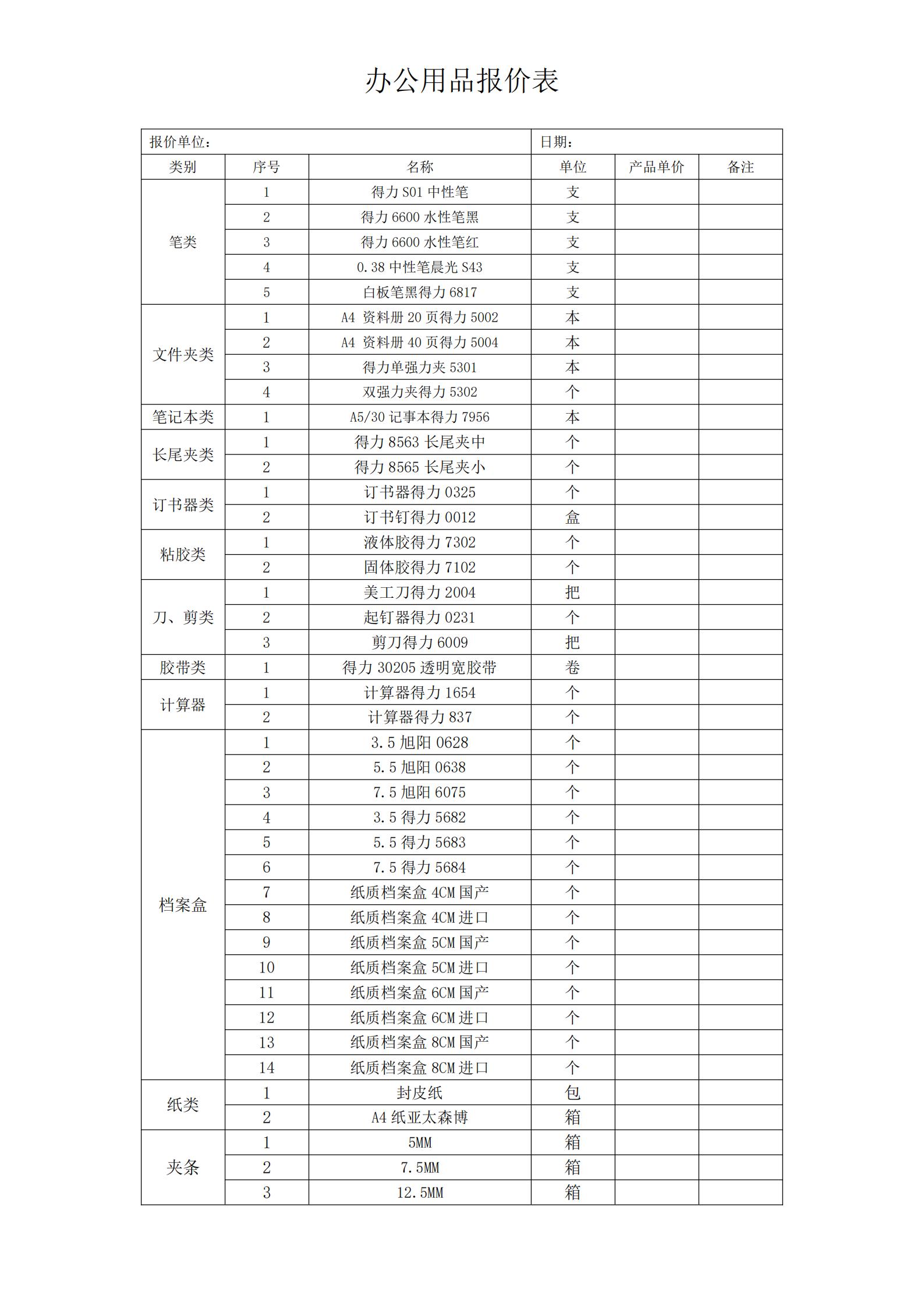 2.供货要求:要求品牌为得力、晨光且满足办公用品采购清单需求。提供优质且符合相关标准的产品,保证交货及时,提供完整的发票和售后服务。